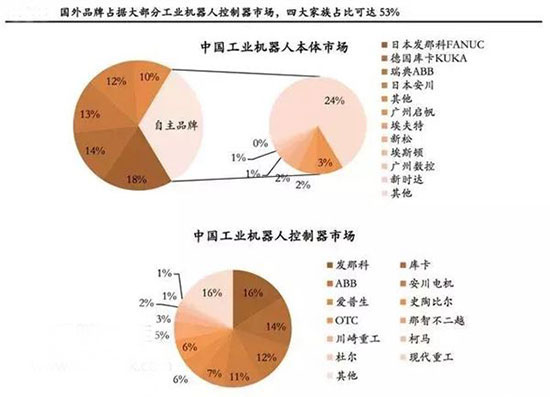 目前國(guó)內(nèi)的上游核心零部件廠商以及中游的本體制造商國(guó)產(chǎn)化率都較低,市面上80%的市場(chǎng)份額都被外資占據(jù)。