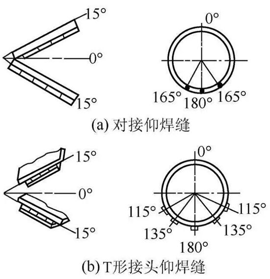 有兩種情況,一種是焊縫傾角在0°~15°,焊接轉(zhuǎn)角165°~180°的對(duì)接焊縫;另一種是角焊縫的焊縫傾角在0°~15°,焊縫轉(zhuǎn)角115°~180°的仰焊位置施焊的焊縫。