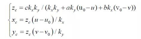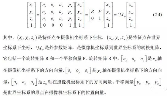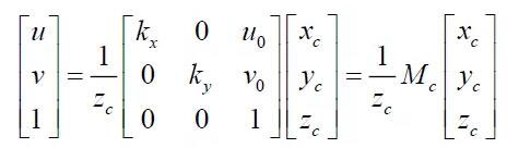 其中:(u,v)是特征點(diǎn)的圖像坐標(biāo),(u0,v0) 光軸中心的圖像坐標(biāo),(kx ky )是X 軸,Y 軸方向的放大系數(shù),(xc yc zc) 是特征點(diǎn)在攝像機(jī)坐標(biāo)系下坐標(biāo), Mc 是攝像機(jī)內(nèi)參數(shù)矩陣。