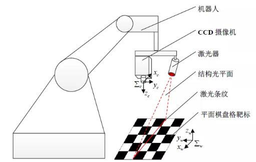 一個(gè)六自由度機(jī)器人,一個(gè)CCD 工業(yè)攝像機(jī),一個(gè)激光器和一個(gè)平面棋盤格靶標(biāo)。