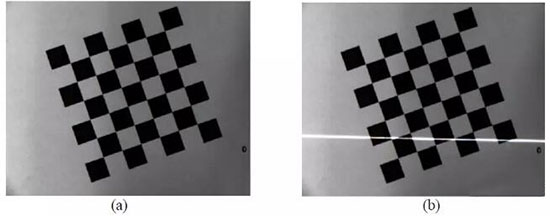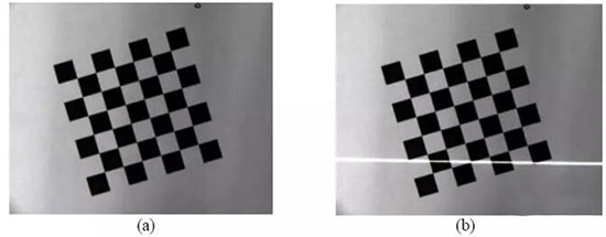 圖像的獲取是在攝機(jī)參數(shù)標(biāo)定過(guò)程中同時(shí)完成。 首先將棋盤格放在工作臺(tái)上, 在這個(gè)初始位置,利用攝像機(jī)采集一幅圖,如圖 (a) 所示 。保持?jǐn)z像機(jī)和棋盤格的位置姿態(tài)不變,打開(kāi)激光器讓條紋投射到棋盤格上, 再采集一幅圖像如圖 (b) 所示: