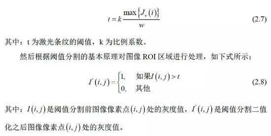 根據(jù)圖像中激光條紋的灰度值高于圖像中其它像素的灰度值以及激光條紋所在區(qū)域比較集中的特點(diǎn),利用圖像ROI 內(nèi)行像素灰度值之和計(jì)算激光條紋的自適應(yīng)閾值:
