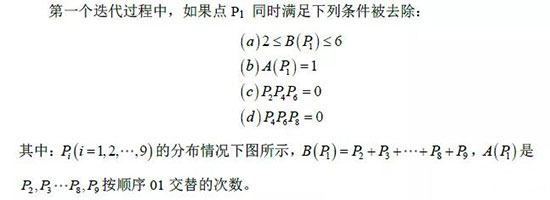 該方法通過(guò)迭代提取圖像骨架,每個(gè)迭代過(guò)程分為兩步,第一步去除東南邊緣和西北角的點(diǎn),第二步去除西北邊緣和東南角的點(diǎn)。