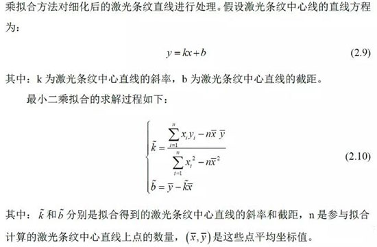 選取激光條紋中心線上的兩個(gè)點(diǎn)作為激光條紋的特征點(diǎn),為了提高激光條紋中心線的提取精度,利用最小二乘法擬合方法對(duì)細(xì)化后的激光條紋直線進(jìn)行處理。