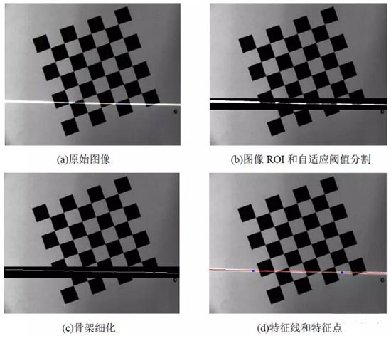 圖像處理的目的是提取激光條紋上特征點(diǎn)的圖像坐標(biāo)。分為圖像感興趣區(qū)域(ROI)確定、自適應(yīng)閾值分割、骨架細(xì)化和特征點(diǎn)計(jì)算。