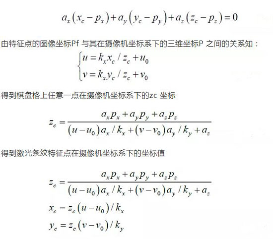 依據(jù)激光條紋特征點(diǎn)圖像坐標(biāo)就可以得到其在攝像機(jī)坐標(biāo)系下的三維坐標(biāo):
