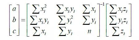 至此,得到四個(gè)激光條紋特征點(diǎn)的圖像坐標(biāo),由上式得四個(gè)激光條紋特征點(diǎn)在攝像機(jī)坐標(biāo)系下的坐標(biāo),由于三點(diǎn)確定一個(gè)平面方程,使用最小二乘法計(jì)算結(jié)構(gòu)光平面方程如下: