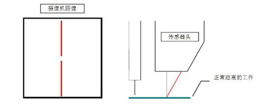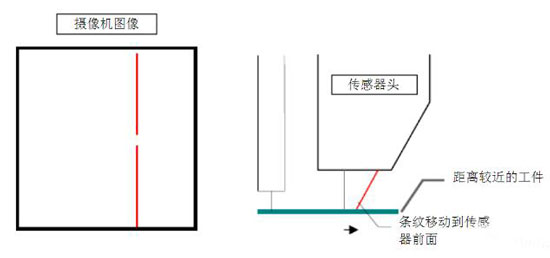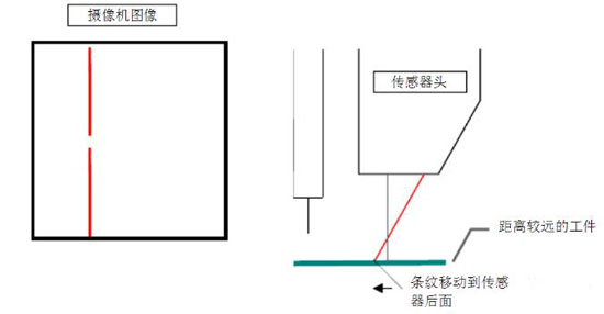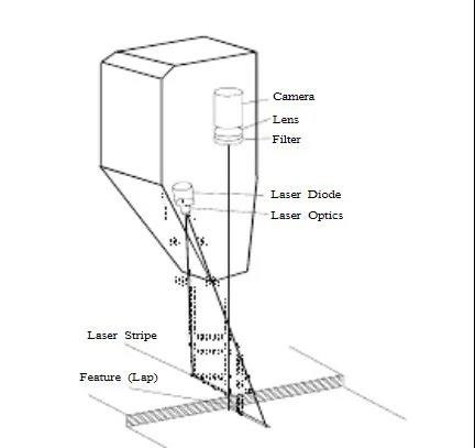 由于激光條紋是以一定的角度投影的,如果工件同傳感器距離太近,激光條紋的位置就相對(duì)靠前。反過(guò)來(lái),如果工件同傳感器距離遠(yuǎn)一些,工件表面激光條紋的位置相對(duì)靠后。攝像機(jī)觀察激光條紋的位置,傳感器能夠測(cè)量距離工件的垂直距離。從條紋的形狀上看,傳感器也能夠測(cè)量表面的輪廓和焊縫在條紋上的位置,這就允許傳感器測(cè)量焊縫的橫向位置。