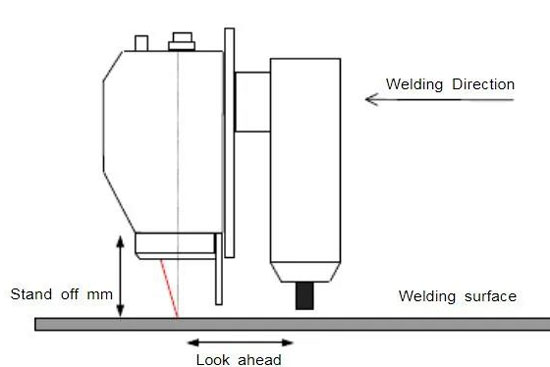 傳感器通常以預(yù)先設(shè)定的距離(超前)安裝在焊槍前部,因此它可以觀察焊縫。傳感器本體到工件的距離也就是安裝高度取決于所安裝的傳感器型號(hào)。當(dāng)焊槍在焊縫上方正確的定位后,焊縫應(yīng)該接近條紋的中心,這才能使得攝像機(jī)觀察到激光條紋和焊縫。