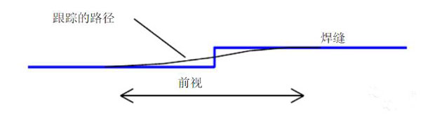 從攝像機(jī)觀察到的圖像被控制器處理,圖像首先被獲取并形成數(shù)字化的激光條紋圖像。然后軟件使用特定的設(shè)置來(lái)將條紋分成形成焊縫的許多條線。從這些線的位置,系統(tǒng)可以測(cè)量焊縫的位置,并將其轉(zhuǎn)化成以mm計(jì)算的距離。這種轉(zhuǎn)化是使用在傳感頭中存儲(chǔ)的校準(zhǔn)數(shù)據(jù)完成的。當(dāng)系統(tǒng)正在進(jìn)行跟蹤時(shí),焊接速度和前視距離被用來(lái)計(jì)算延遲時(shí)間。這就保證焊槍而不是傳感器沿著焊縫行進(jìn)。應(yīng)該指出的是控制策略提供了平滑的前視距離以保證形成平滑的焊縫。因此如果傳感器在路徑上遇到了一個(gè)臺(tái)階的變化,他將會(huì)提供一個(gè)平滑的響應(yīng),如下圖所示。