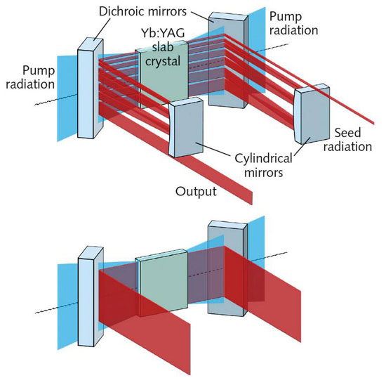 雖然皮秒和飛秒光纖激光器具有許多非凡的質(zhì)量,但是對(duì)于最高平均功率的超快光,人們必須轉(zhuǎn)向大體積固態(tài)激光器。研究人員不僅致力于克服超快激光功率限制,而且還致力于開(kāi)發(fā)從脈沖產(chǎn)生到工藝技術(shù)以及實(shí)際應(yīng)用的整個(gè)工藝鏈中的技術(shù)。使用InnoSlab技術(shù)(兩個(gè)散熱器之間的矩形晶體,通過(guò)準(zhǔn)直激光二極管縱向泵浦),已構(gòu)建了一種超快放大器,該放大器以500 kHz的頻率發(fā)射能量略大于1 mJ的壓縮脈沖,平均功率為530 W。使用充氣的Herriott型電池,研究人員已證明脈沖持續(xù)時(shí)間從590降低到30 fs,而能量損失不到5%。