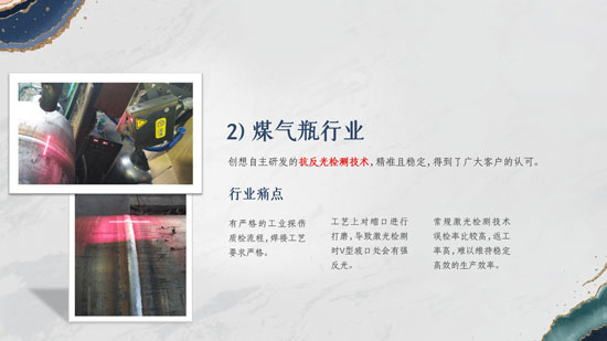 針對(duì)環(huán)縫焊接行業(yè)的插接焊縫和常規(guī)拼接焊縫,創(chuàng)想激光焊縫跟蹤器采用三角反射式原理,檢測焊縫的穩(wěn)定特征點(diǎn)來確定焊縫的位置。