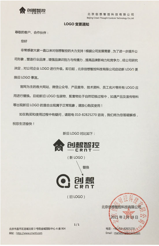 非常感謝大家一直以來(lái)對(duì)創(chuàng)想智控的大力支持!根據(jù)公司發(fā)展需要,為了進(jìn)一步提升公司形象,塑造行業(yè)品牌,增強(qiáng)品牌識(shí)別力與傳播力,提高品牌影響力和競(jìng)爭(zhēng)力,經(jīng)公司研究決定,對(duì)公司企業(yè)LOGO進(jìn)行升級(jí)。即日起,北京創(chuàng)想智控科技有限公司啟動(dòng)新LOGO更換舊LOGO事宜。